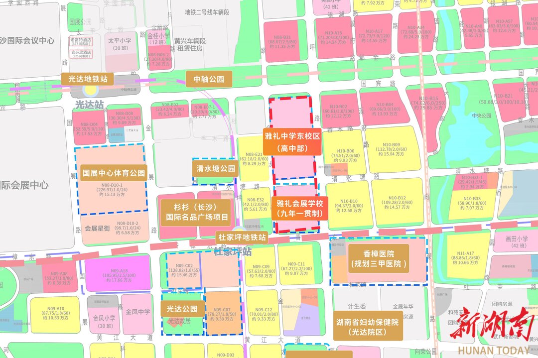 长沙国际会展新城教育雅礼会展学校(小学+初中)占地面积约87亩,办学规模为54个班,为公办九年一贯制义务教育学校,由长沙市雅礼中学进行委托管理办学,按照片区内“相对就近”原则及当年招生政策入读。该项目现已立项,正在进行前期设计工作,预计2025年动工,2026年秋季开学。