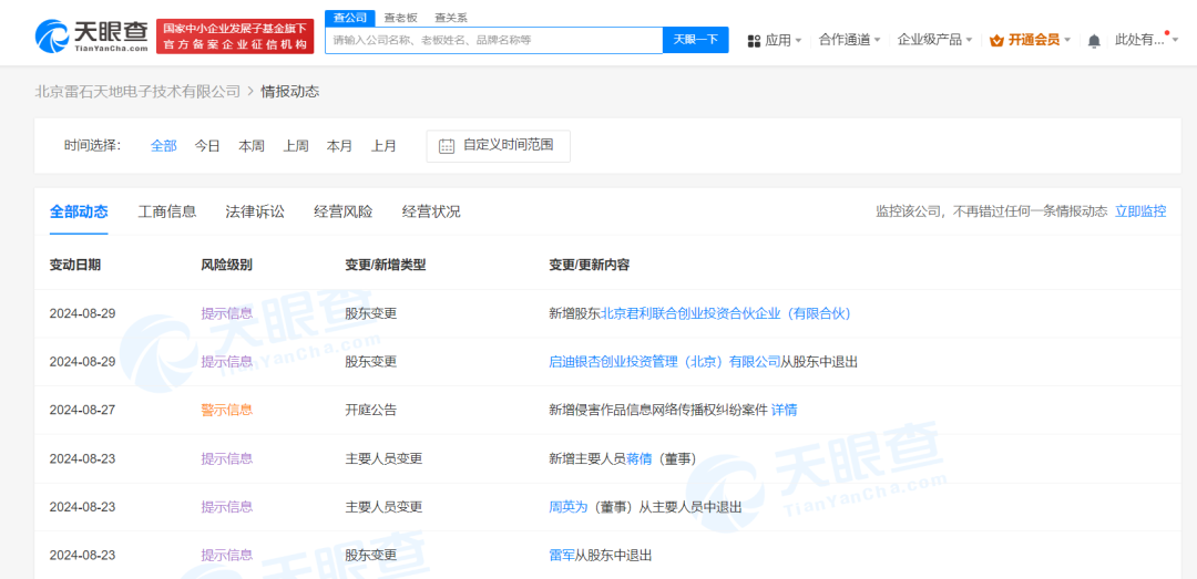 天眼查App显示,近日,北京雷石天地电子技术有限公司发生工商变更,雷军、启迪银杏创业投资管理(北京)有限公司退出股东行列,新增北京君利联合创业投资合伙企业(有限合伙)为股东。