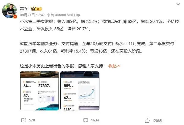 在谈及上述热搜时,他进一步表示,“我觉得这个算得既对也不对,因为小米汽车还在投入期,刚刚开始,我觉得我们的财务表现还是不错的,的的确确在第二季度,我们在智能汽车等创新业务上亏了18个亿,换句话说投入了18个亿,但等我们到了一定的规模,我相信很容易打平的,所以大家不用替我们焦虑。”