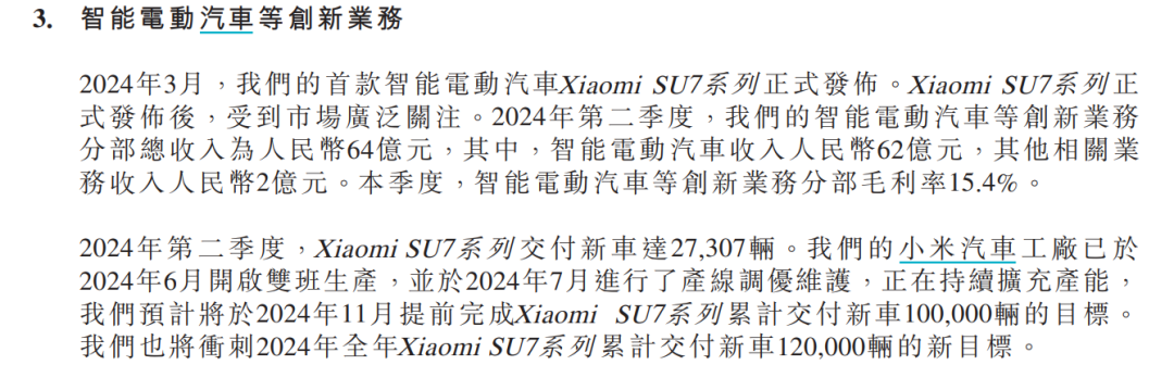 小米集团总裁卢伟冰在业绩会表示,小米汽车SU7亏损的原因在于,第一,目前小米汽车的规模较小,而汽车是一个典型的规模经济的行业,未来有信心做大汽车的规模;第二,小米第一辆车是纯电轿车,其投入成本本身就比较高,消化这部分成本还是需要一定的时间。