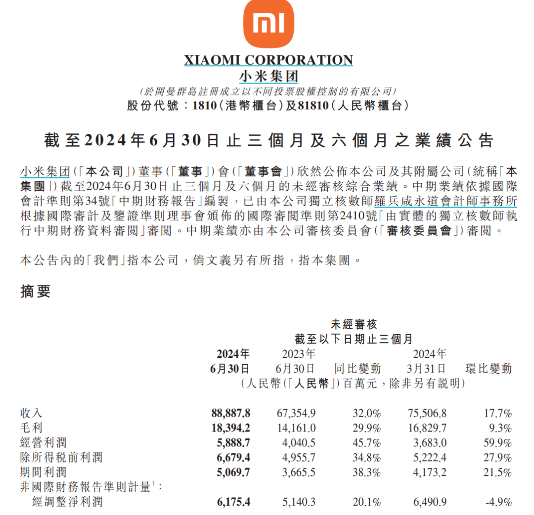 小米集团披露2024年上半年及二季度业绩,第二季度营收888.9亿元,同比增长32%,创历史新高;调整后净利61.8亿元,同比增长20.1%。业务分部来看,智能电动汽车等创新业务分部,收入为人民币64亿元,经调整净亏损18亿元,交付27307辆,毛利率15.4%。