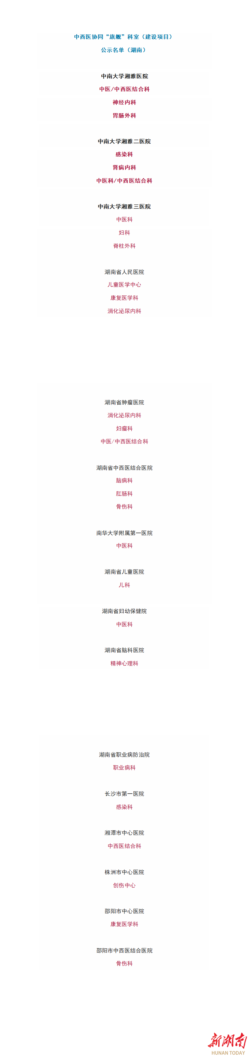 湖南日报8月30日讯(全媒体记者 周倜 通讯员 吴健)记者今天从湖南省中医药管理局获悉,日前,国家中医药管理局正式发布了国家中西医协同“旗舰”科室的建设单位和培育单位名单,其中,湖南入围28个建设单位,入围数量居全国第5,入围比例达96.55%。(点击下图,看看湖南上榜的科室单位!)