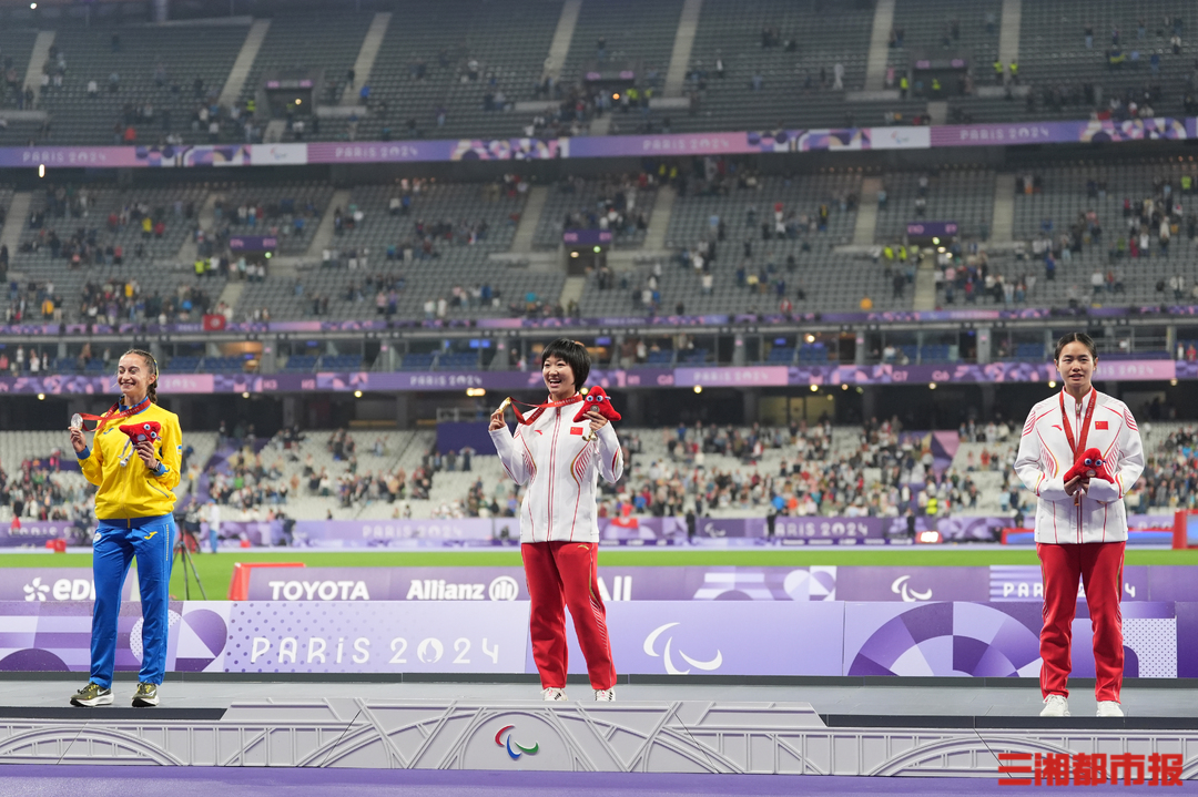 8月31日,巴黎残奥会田径项目女子200米T37级颁奖台上,湖南运动员文晓燕(中)与蒋芬芬(右)。通讯员 姜浪 供图