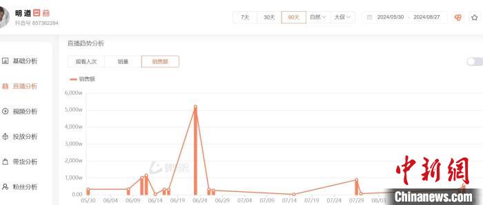 图为“蝉妈妈”平台显示的明道直播间近三个月直播带货销售数据。(来源:截图)