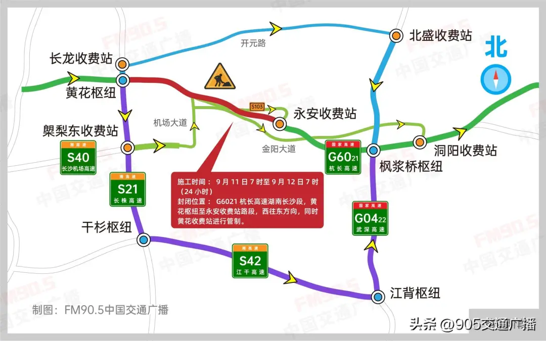G0621杭长高速湖南长沙段,永安收费站至黄花枢纽路段,东往西方向。同时,永安、黄花收费站入口进行管制。