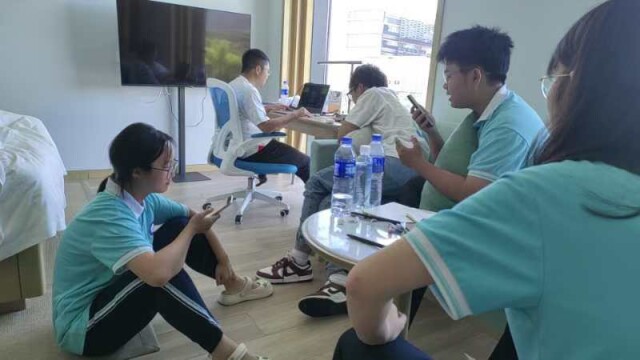 (娄底一中代表队辩手们正在酒店房间里激烈讨论辩题。受访者供图)