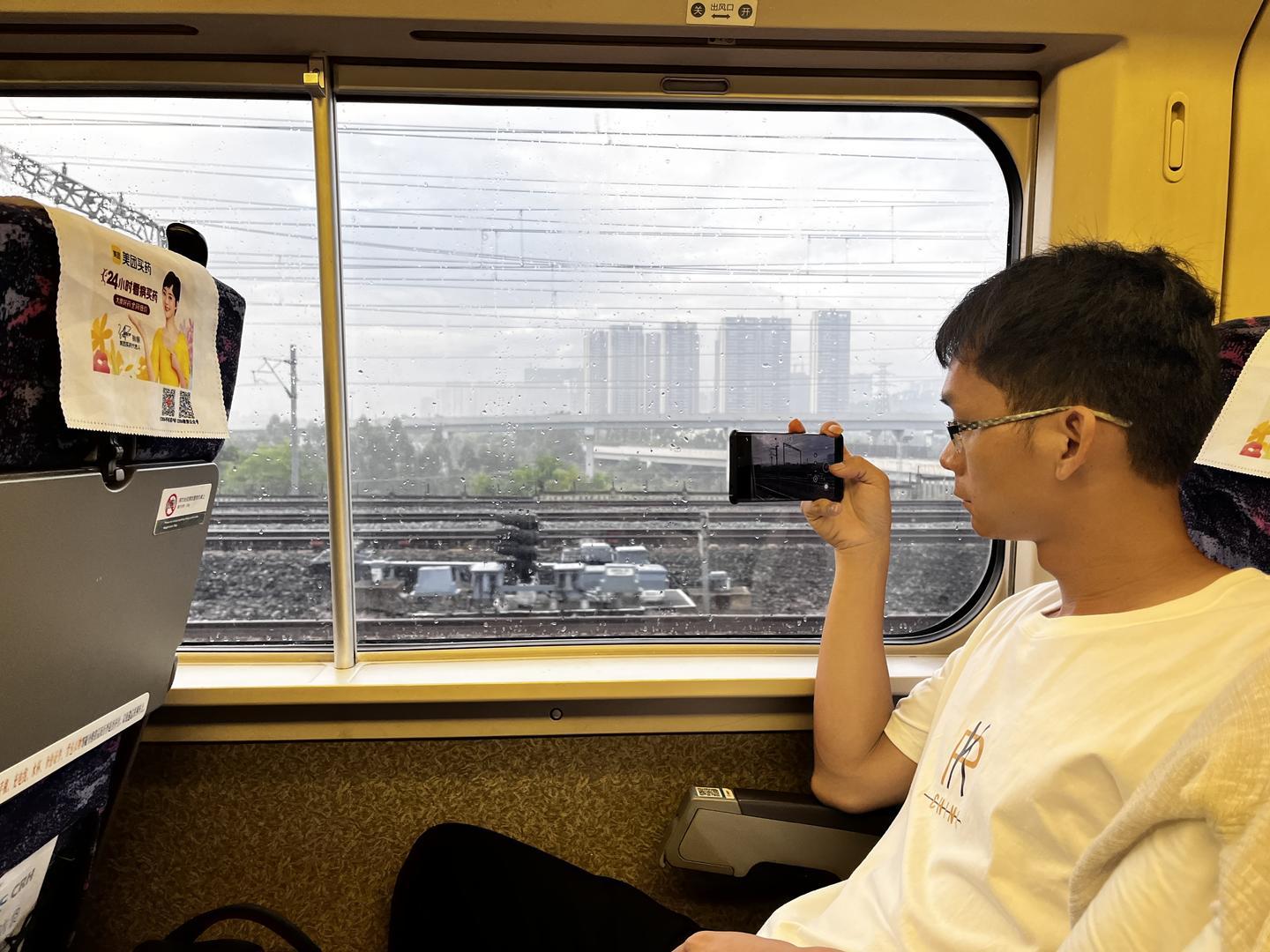 唐尚珺的座位靠窗,玻璃窗户上还挂着水珠。列车开动后,他拿起手机拍下窗外的景色,表示这次旅途心情和以往还是有点不一样。