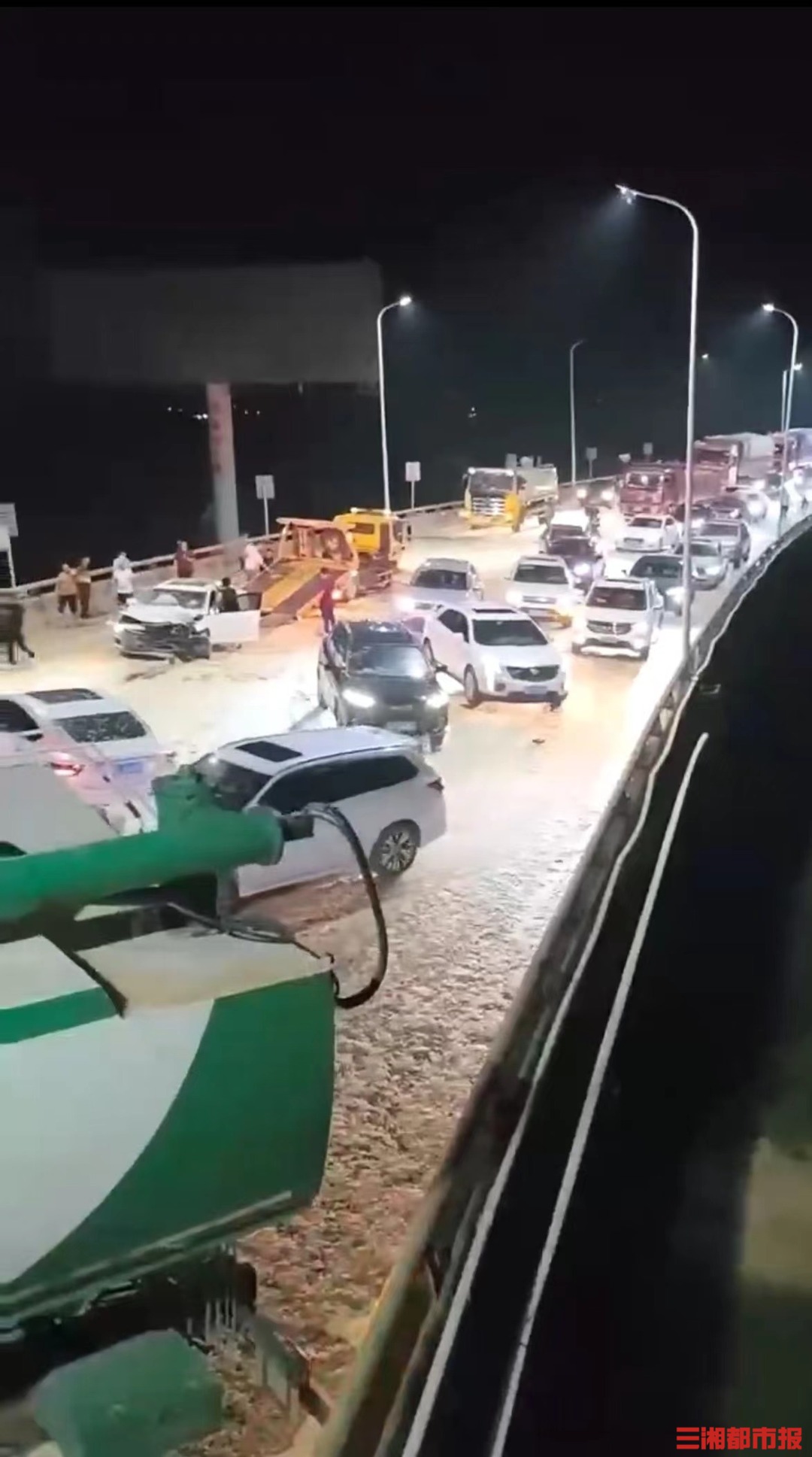三湘都市报·新湖南客户端9月2日讯(文/视频 田甜)9月1日20时30分许,湖南常德汉寿沅水大桥惊现大量蜉蝣,蜉蝣“婚飞”如同下雪,堆积在大桥上最厚处达5厘米。因路面打滑,桥面两车发生相撞,导致了大桥上拥堵。汉寿县公安、交警、环卫、公路、农业等部门连夜出动,目前,桥面道路清理已完成。