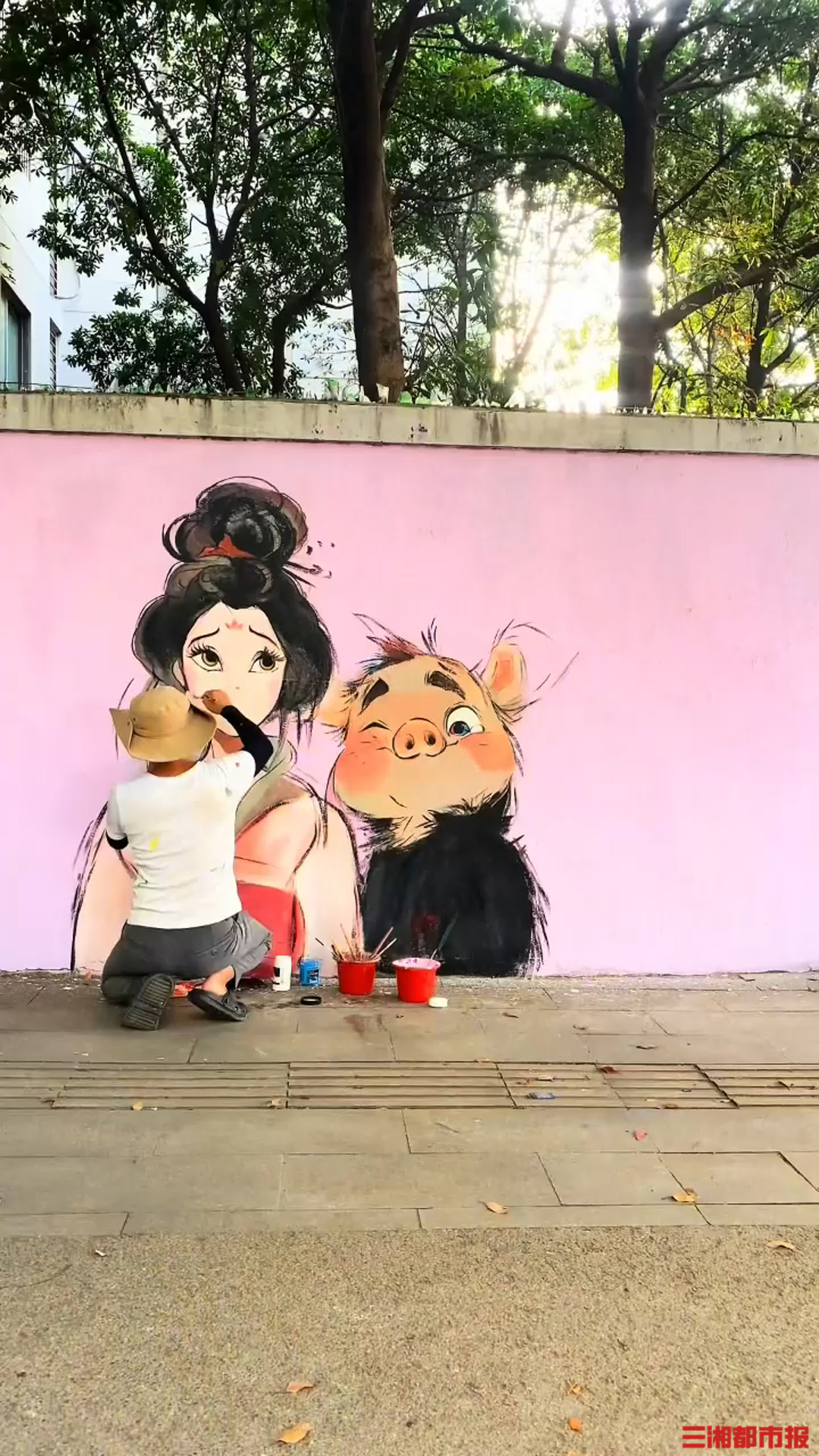 9月2日,记者联系采访到彩绘墙的创作者王雁,他今年33岁,湖南新宁人,是一名手绘爱好者,经常在城市和乡村做公益性绘画。