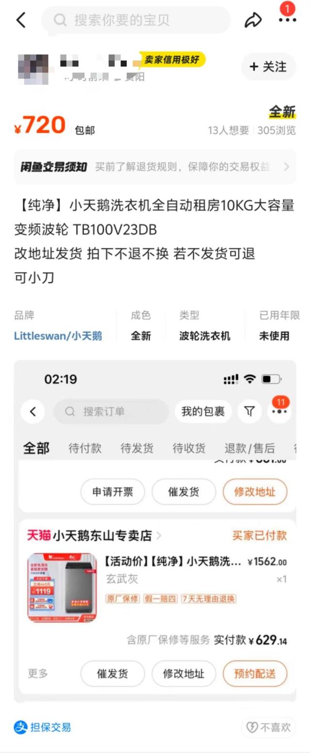 红星新闻注意到,在二手平台闲鱼上,已有一些网友对自己低价抢购的小天鹅洗衣机加价出售。如一名网友挂出的信息显示,其在“小天鹅东山专卖店”以约629元的实付款,抢购的价值1562元洗衣机,正在以720元的价格进行转卖。转卖介绍中称:“可改地址发货……若不发货可退,(价格)可小刀。”