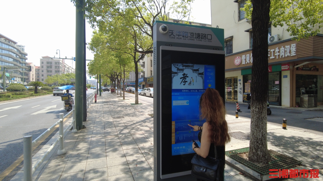 三湘都市报·新湖南客户端9月3日讯(全媒体记者 叶竹 通讯员 余梦璇 谭晓波)轻触电子屏就可查线路、查换乘、查景点、查商场,还能实时播报车辆动态,长沙县天华路、东六路附近的居民、乘客发现,该路段上的部分公交站增加了电子智慧公交站牌。9月2日,三湘都市报记者来到长沙市长沙县天华路凉塘路口站,一块显目的电子屏立在公交车站一侧,等车乘客正在点击屏幕,查询路线。