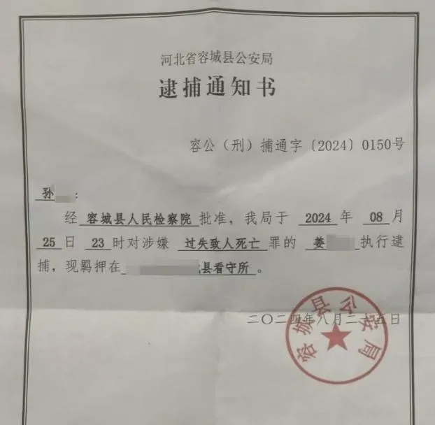 据这两份文书显示,8月11日,姜某某因涉嫌过失致人死亡罪被刑拘;8月25日,经容城县人民检察院批准,容城县公安局以涉嫌过失致人死亡罪对姜某某执行逮捕。