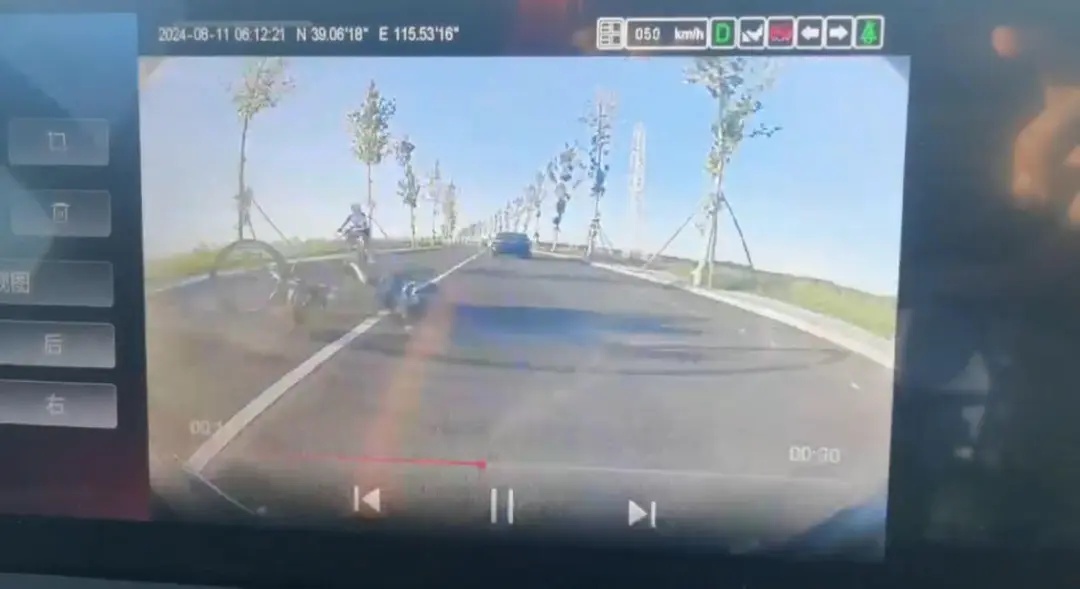 行车记录仪画面显示,8月11日上午6点12分,几名自行车骑行者从汽车左侧的车道上迎面而来。突然,骑行队伍中1人摔倒,跌到车道上并疑似被汽车碾压。另一段视频中,一个身穿骑行服的男孩趴在地上一动不动,一名男子趴在他的身上呼喊:“你坚持住……”