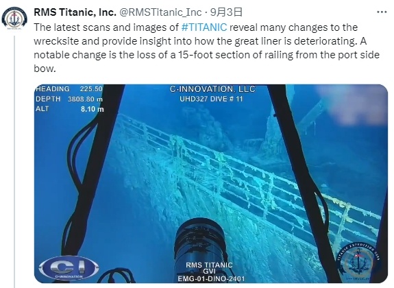 皇家邮轮泰坦尼克号公司9月2日在社交媒体平台X说,最新勘测显示,“泰坦尼克”号船头左舷一侧有一段约4.5米长的栏杆已经掉落。