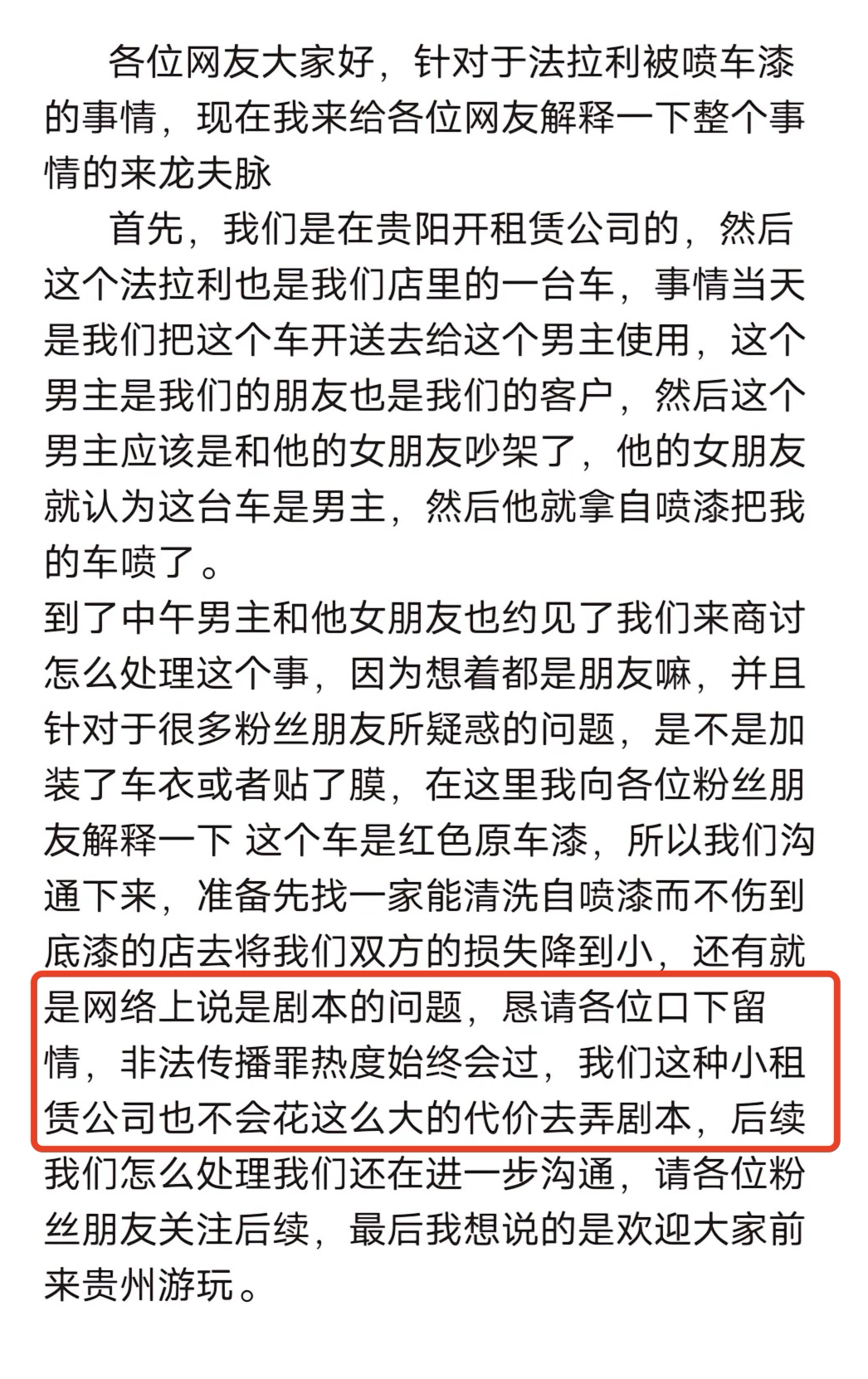 声明中,该工作人员表示,此事非“剧本炒作”,“我们这种小租赁公司也不会花这么大的代价去弄剧本。”他还说,车辆未贴有车衣,车是红色原车漆,正在想办法将双方损失降到最小。