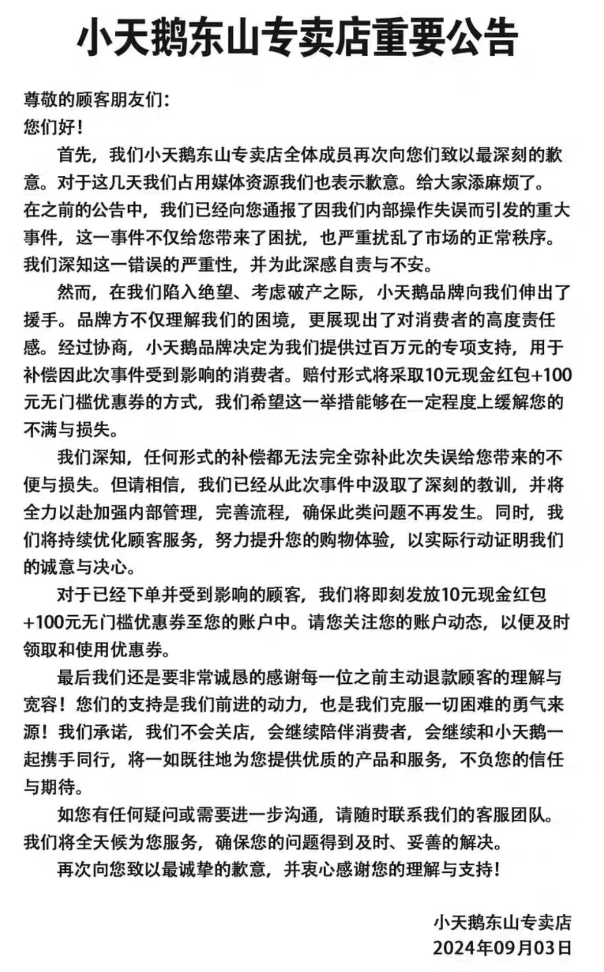 而“小天鹅东山专卖店”遭遇“价格乌龙”事情的最新进展是,9月3日,小天鹅东山专卖店发布公告称,小天鹅品牌决定为该店铺提供过百万元的专项支持用于补偿因此次事件受影响的消费者。