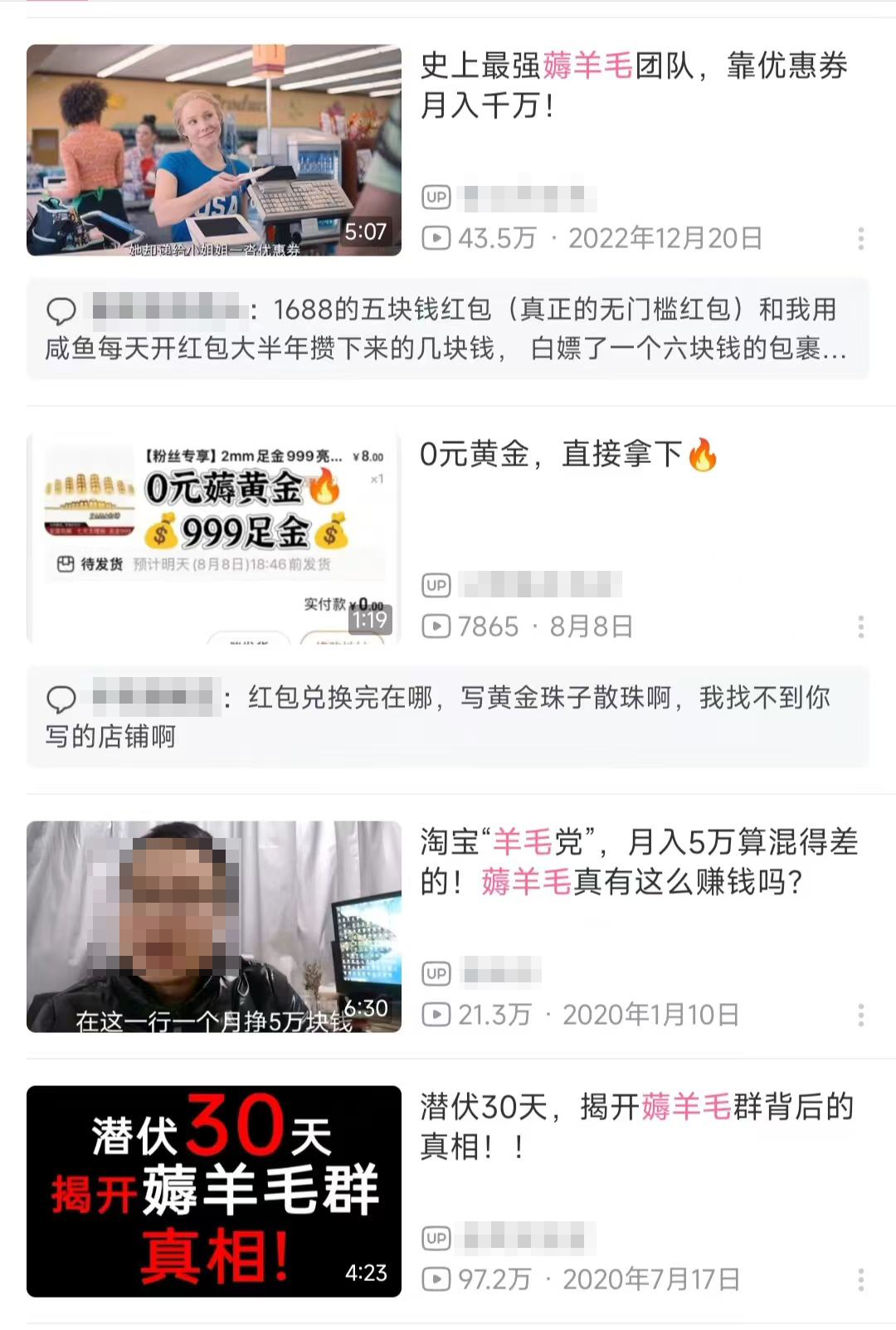 “挑战薅羊毛年入百万”“最强薅羊毛团队,靠优惠券年入千万”“一个月挣5万,算混得差”......打开社交媒体,扑面而来的是有关羊毛党的暴利教程,有B站UP主每周都会发布一期“白嫖视频”,分享“羊毛区UP主一周可以薅多少羊毛”,此外还会分享淘宝、京东、抖音等“攻略”,目前粉丝已经接近10万。