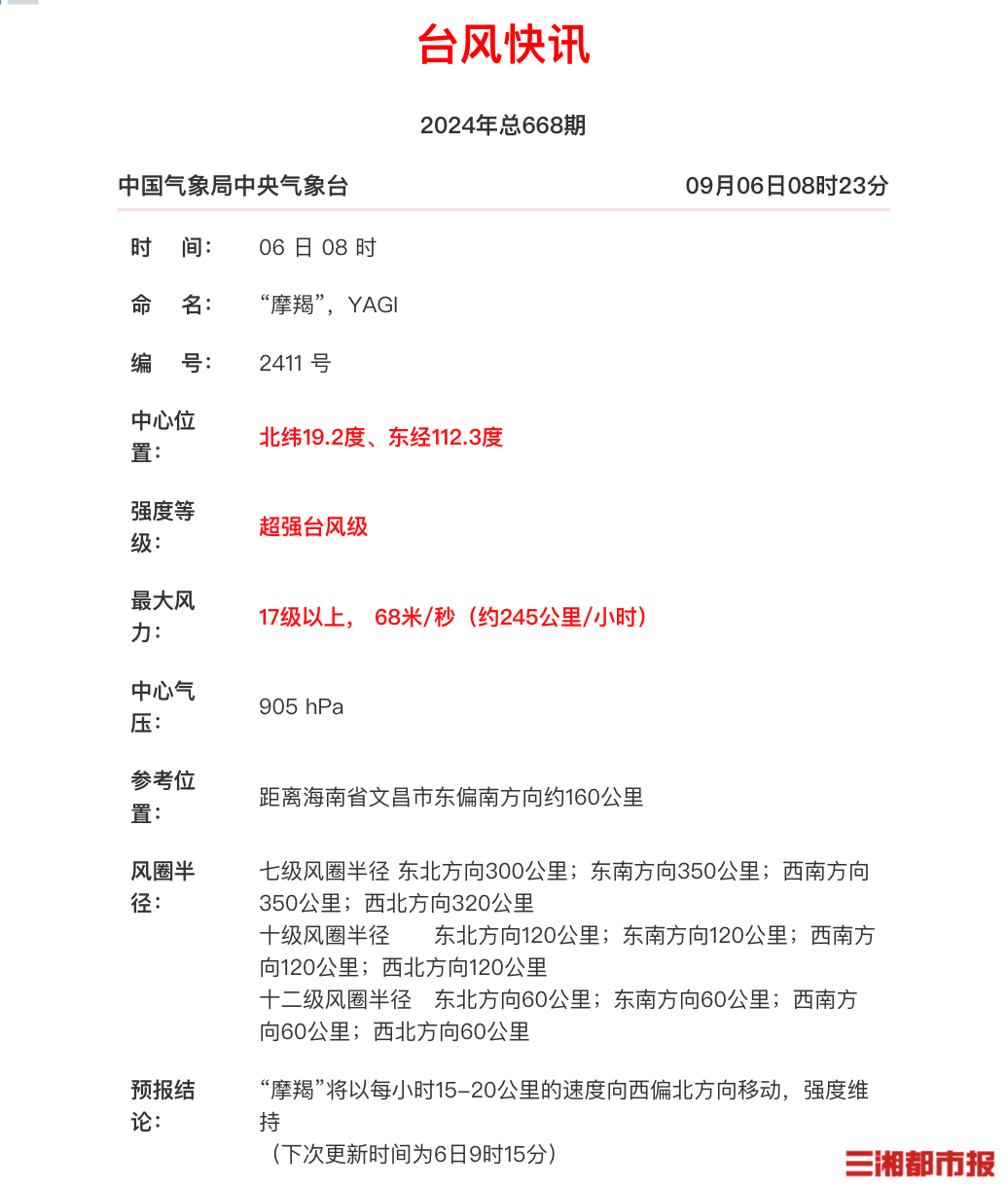 三湘都市报·新湖南客户端9月6日讯(全媒体记者 李致远)9月6日,据中央气象台消息,目前超强台风“摩羯”中心附近最大风力已经达到惊人的68米/秒(约245公里/小时)。已经非常接近当年10年前的威马逊了(巅峰强度72m/s,登陆海南70m/s)。