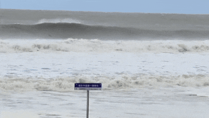 6日,受台风“摩羯”影响,广东徐闻海边风力约有9级,海浪最高超过6米,预计未来风浪还会加大。“摩羯”掀起的海浪,将2吨重的挡浪石,直接冲到海堤之上。