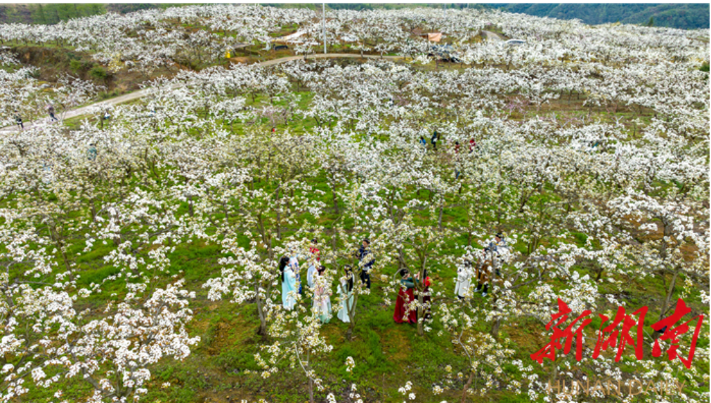 “今年春天,基地万株梨花竞相开放,洁白如雪,香气袭人,吸引了周边众多游客穿上汉服前来打卡游玩。”浏阳市驻茅坪乡帮扶工作队队长周洋介绍。