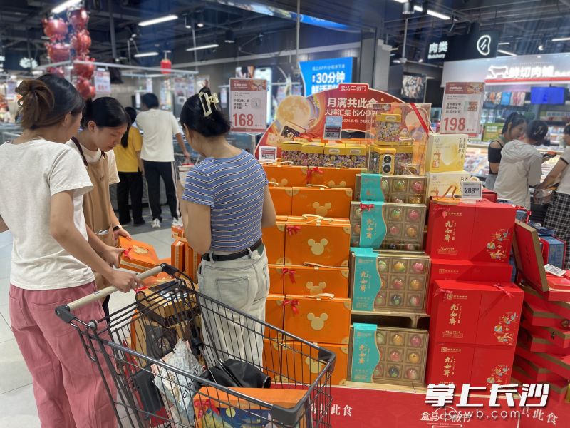 盒马鲜生超市里,各种月饼礼盒在货架上摆放得满满当当。长沙晚报通讯员 杨田风 摄