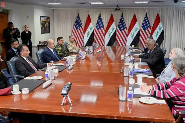 当地时间2024年7月23日,华盛顿五角大楼,美国国防部长奥斯汀(右)会见伊拉克国防部长萨比特·阿巴西。 路透社