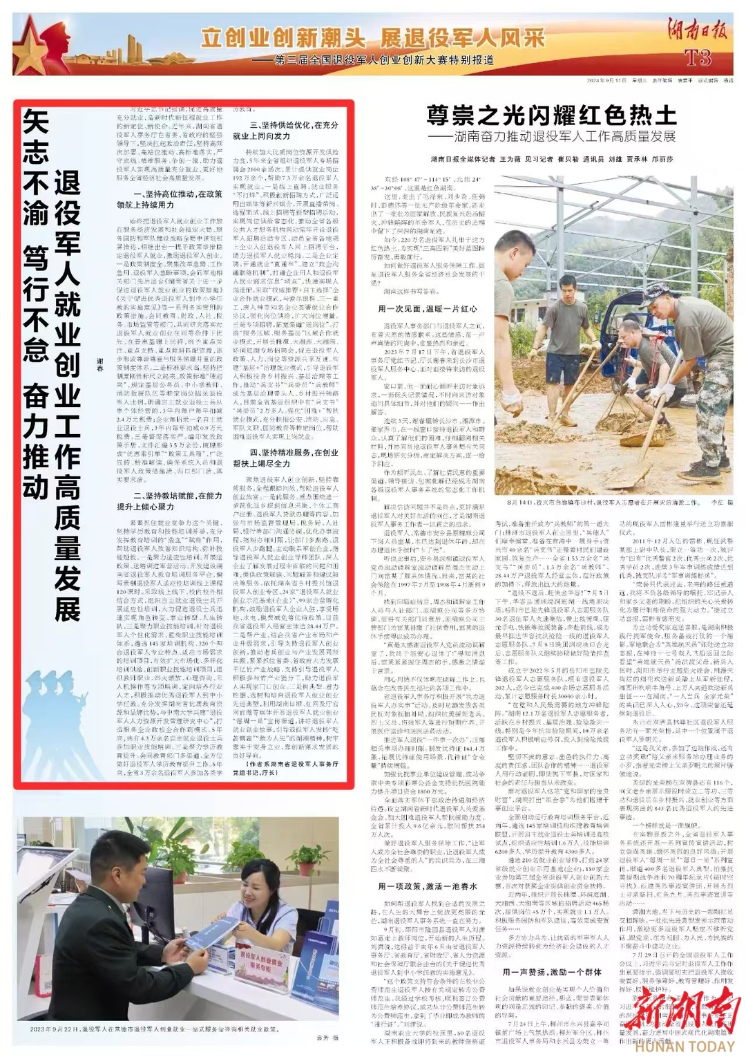 聚焦退役军人创业创新,坚持靠前服务,全程跟踪问效,帮助退役军人创业致富。一是优服务。重点围绕进一步简化返乡报到信息采集、个体工商户注册、退役军人贷款办理等内容,加强与市场监督管理局、税务局、人社局、银行等部门沟通协调,优化办事流程,缩短办理时限,让部门多跑路、退役军人少跑腿。主动联系军创企业,指导退役军人就业创业导师团队,深入企业了解发展过程中面临的问题和困难,提供政策解读、问题解答和建议解决等服务。依托湖南省乡村振兴馆退役军人创业专区、24家“退役军人就业创业示范基地(企业)”、99家自营孵化机构,鼓励退役军人企业入驻,享受场地、水电、税费减免等优待政策。目前我省退役军人经营主体达28.44万户。二是帮产业。结合我省产业布局和产业升级需求,引导支持退役军人创业创新,推动老兵创业与产业发展同频共振。紧紧抓住省委、省政府大力发展千亿竹产业战略,支持引导退役军人积极参与竹产业链分工,助力退役军人实现家门口创业。三是树典型。着力挖掘、选树和培育退役军人就业创业先进典型,利用湖南日报、红网及厅官网官微等媒体开展退役军人就业创业“每周一星”宣传报道,讲好退役军人就业创业故事,引导退役军人发扬“吃苦霸蛮”“敢为人先”的湖湘精神,树牢靠实干安身立业、靠创新谋求发展的良好导向。