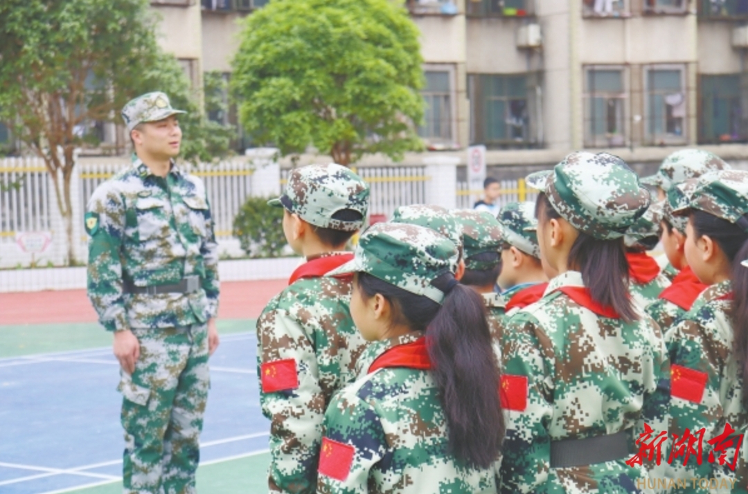 2023年5月,湘乡市军锋企业管理有限公司总经理文彬带领湘乡向阳学校学生开展国防特色课程室外训练。