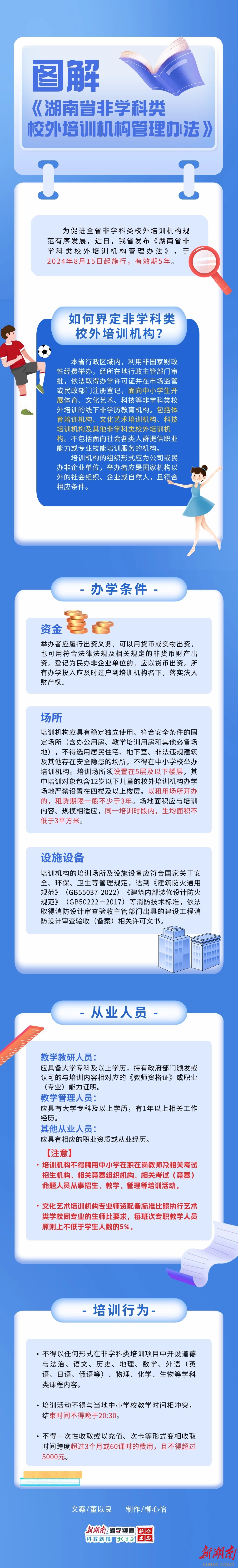 《通知》明确,设置非学科类校外培训机构须达到《湖南省非学科类校外培训机构管理办法》中的基本要求。各级教育、民政、市场监管、体育、文化、科技、住建、消防部门要加强对非学科类校外培训机构的常态化监管,全面落实负面清单制度,加强年检年报、收费与资金监管、广告管控、培训内容备案、培训材料审核等管理工作,指导非学科类校外培训机构加强党的建设。