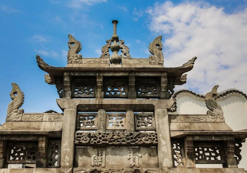李瀚章还重建了高约10米,宽约6米的“道冠古今”牌坊,整个牌坊厚重俨然,端庄大方。其坊柱上雕刻着二龙戏珠、狮子绣球、麒麟、卷草等图样和纹饰,龙头鱼身吻兽簇拥着中心的葫芦在重檐上兀立,刀法精细、明晰。牌坊正门额坊上刻着“道冠古今”,背面是“贤关”,寄托通过贤能之人,让道贯穿古今的良好企望。