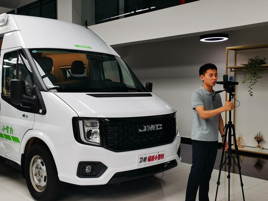 在江苏省扬州市仪征市陈集镇卫航房车展厅,主播在直播连线介绍房车产品(8月27日摄)。新华社记者 蒋文茜 摄