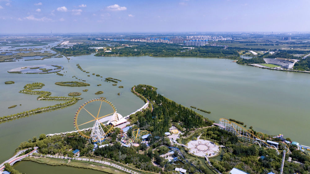 ↑这是6月23日拍摄的宁夏银川市海宝湖周边景色(无人机照片)。新华社记者 王鹏 摄