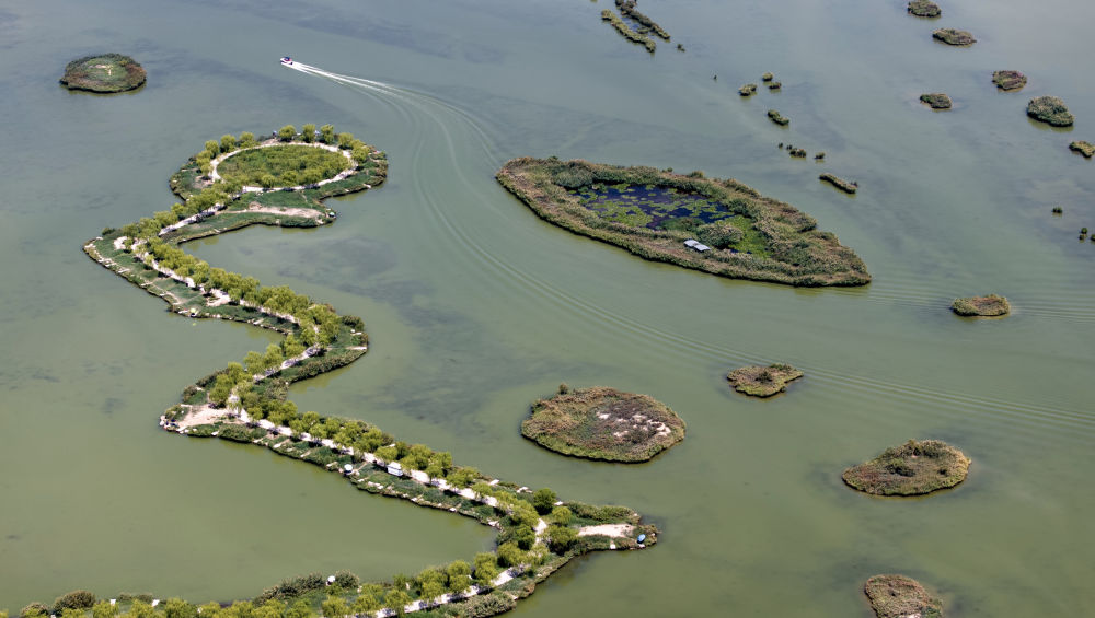 ↑市民在银川市宝湖国家城市湿地公园乘船休闲(8月21日摄,无人机照片)。新华社记者 冯开华 摄
