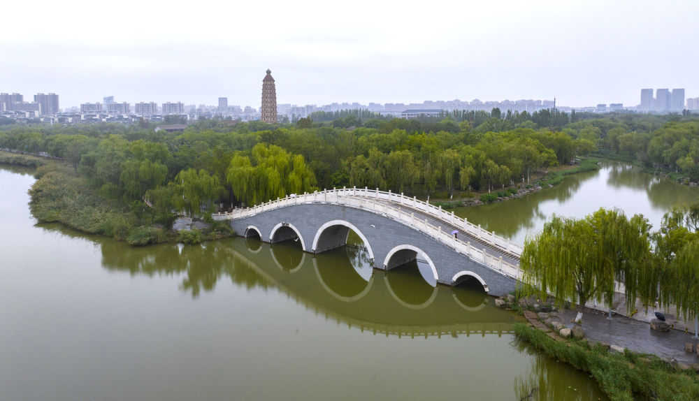 ↑这是6月23日拍摄的宁夏银川市典农河与凤凰桥(无人机照片)。新华社记者 王鹏 摄