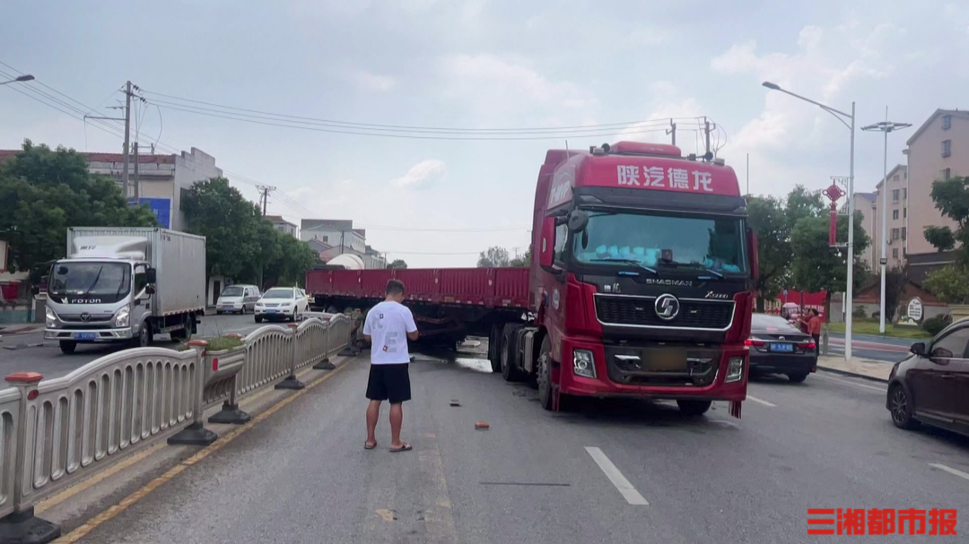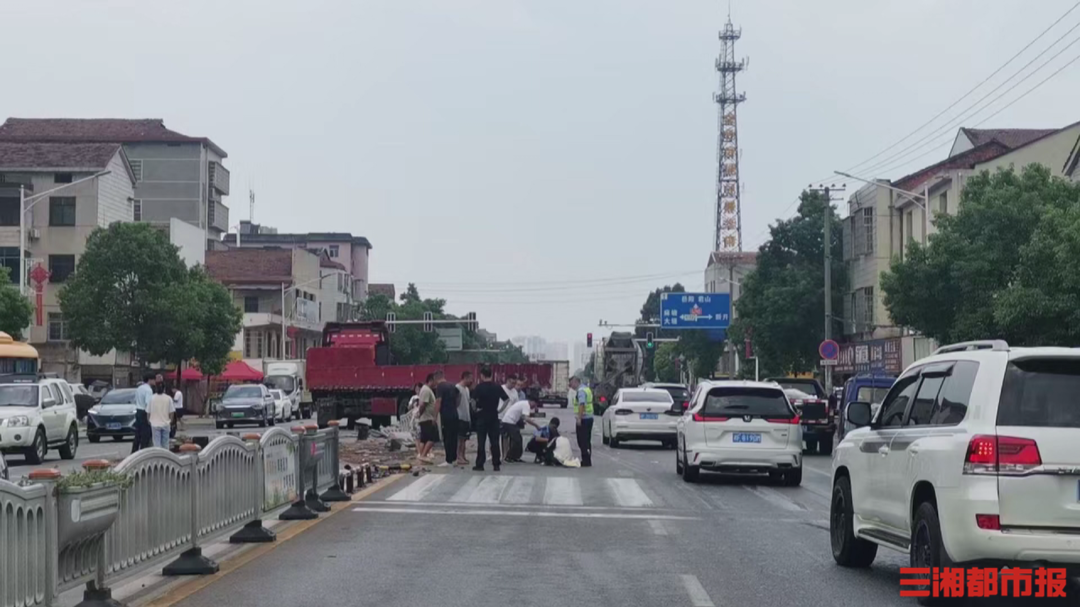 9月9日11时37分,国道240线湖南岳阳县荣家湾镇麻塘集镇路段一斑马线处,公共场所视频显示:一名行人从画面右侧走上斑马线,一辆大货车快速驶来,司机发现行人后急刹车避让,造成货车挂车甩尾打横,径直将行人撞倒卷入车底。行人卷入车底后,幸运地从挂车轮胎间空隙穿过,没有遭到碾压。货车撞坏中央护栏,冲入对向车道,好在当时对向车道没有车辆经过,没造成更严重后果。
