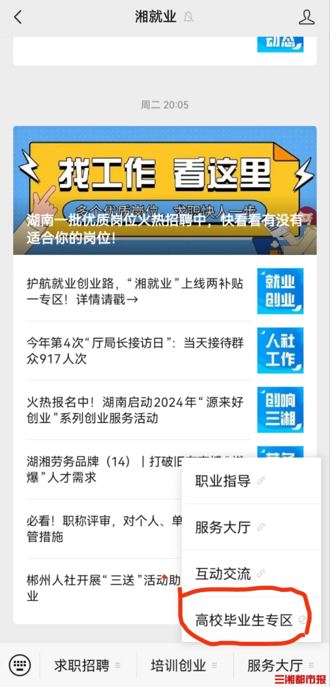手机进入“湘就业”微信公众号,点击底部“培训创业”—“创业专区”进入即可找到“创业政策”“创业培训”“创业贷款”等八大服务。