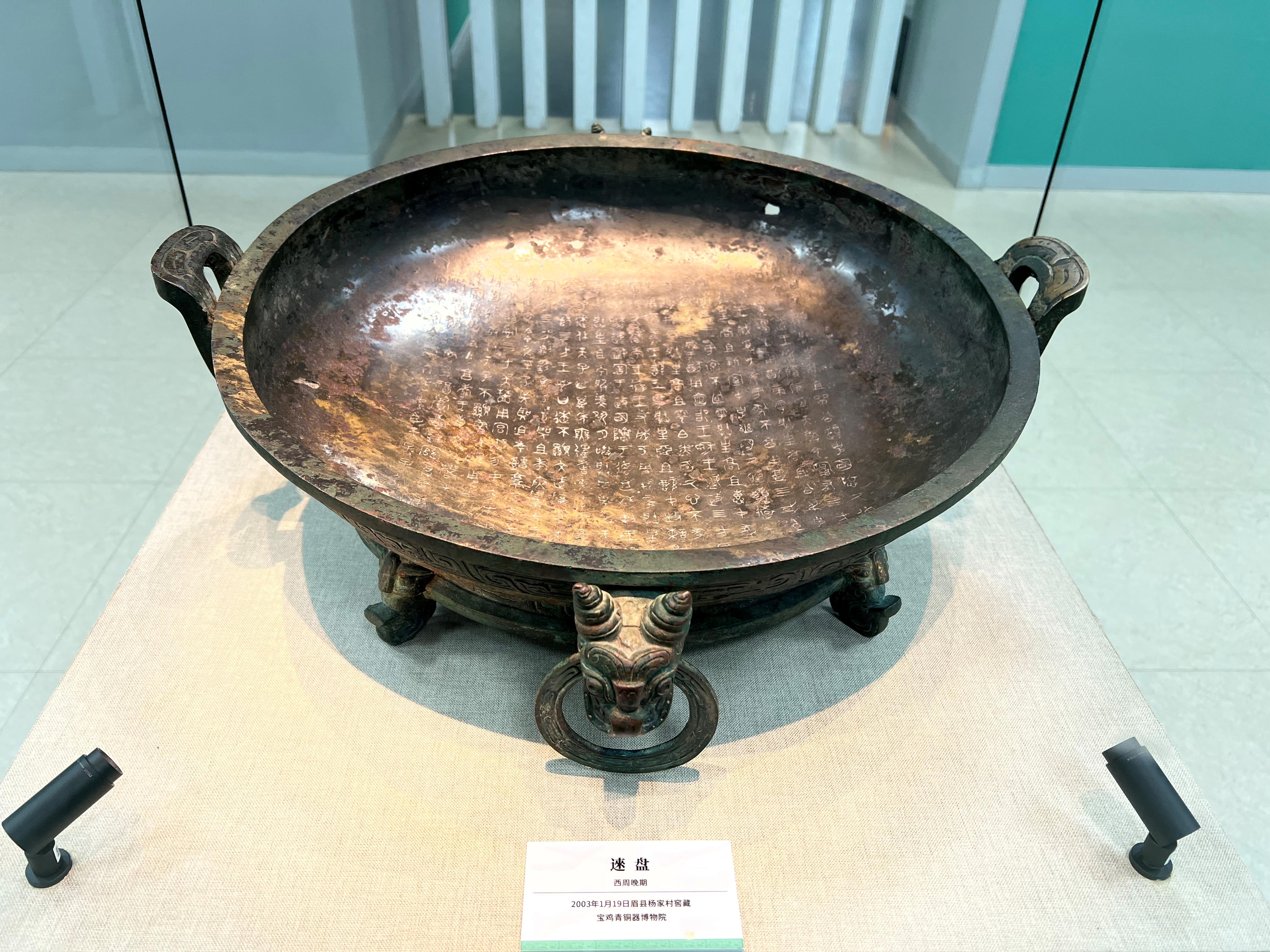 △被誉为“青铜史书”的逨盘,它是新中国成立以来出土铭文最长的铜盘。(总台央视记者丁欣拍摄)