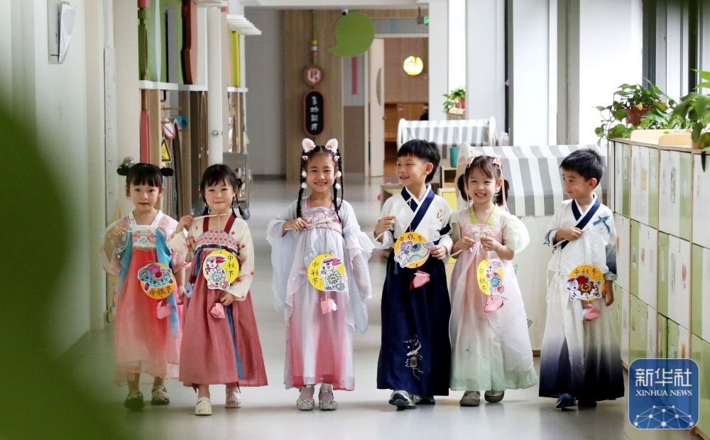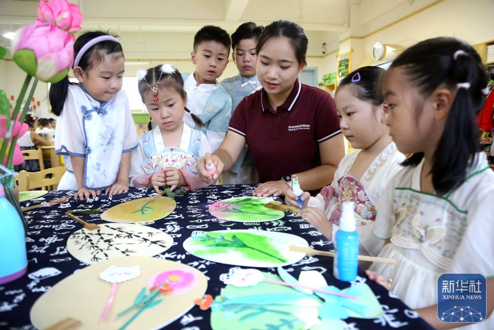 9月11日,在江苏省连云港市钟声幸福幼儿园,老师指导小朋友制作中秋团扇。新华社发(王春摄)