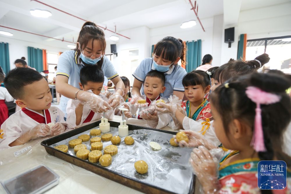 9月12日,浙江省台州市仙居县迎晖幼儿园小朋友在老师的指导下学做手工月饼。新华社发(王华斌摄)