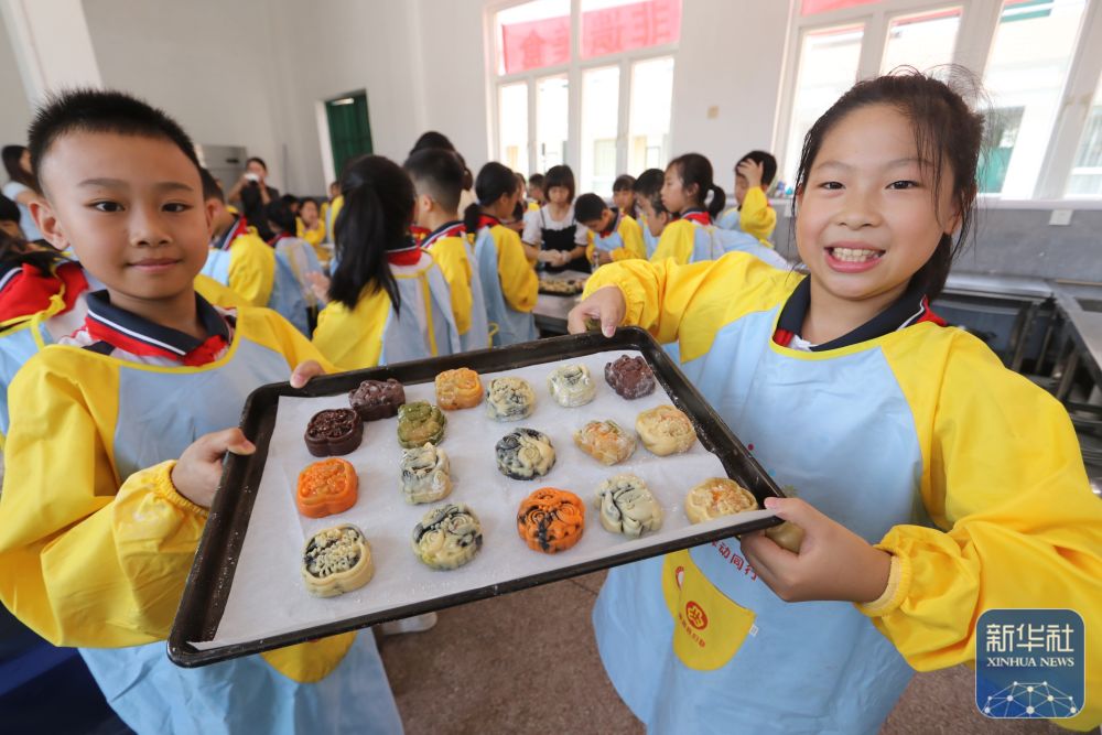 9月12日,福建省南平市顺昌县实验小学思贤校区的学生展示在家长指导下制做的月饼。新华社发(陈柏材摄)