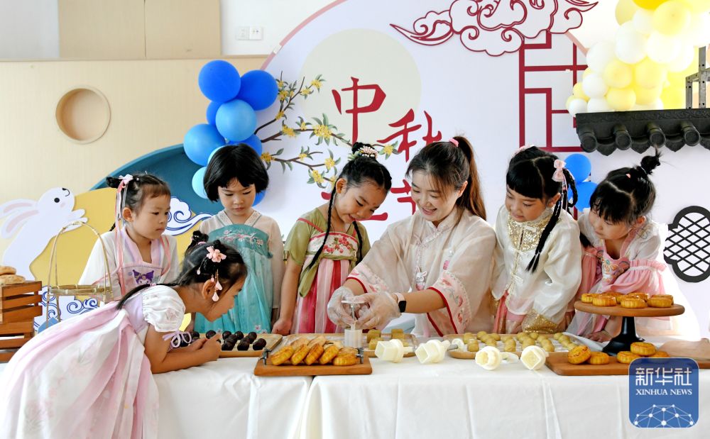 9月12日,贵州省黔南布依族苗族自治州都匀市青云湖幼儿园的老师和孩子们一起制作月饼。新华社发(肖伟摄)