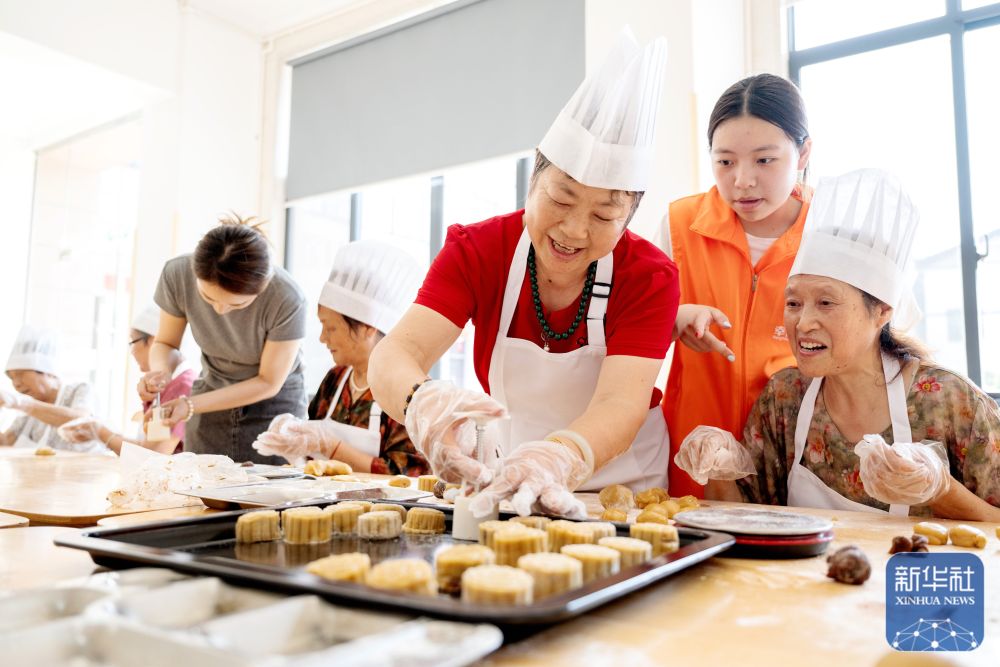 9月12日,浙江省湖州市长兴县林城镇百叶龙社区老年学堂,老年人将压制成型的手工月饼放入烤盘。新华社发(谭云俸摄)