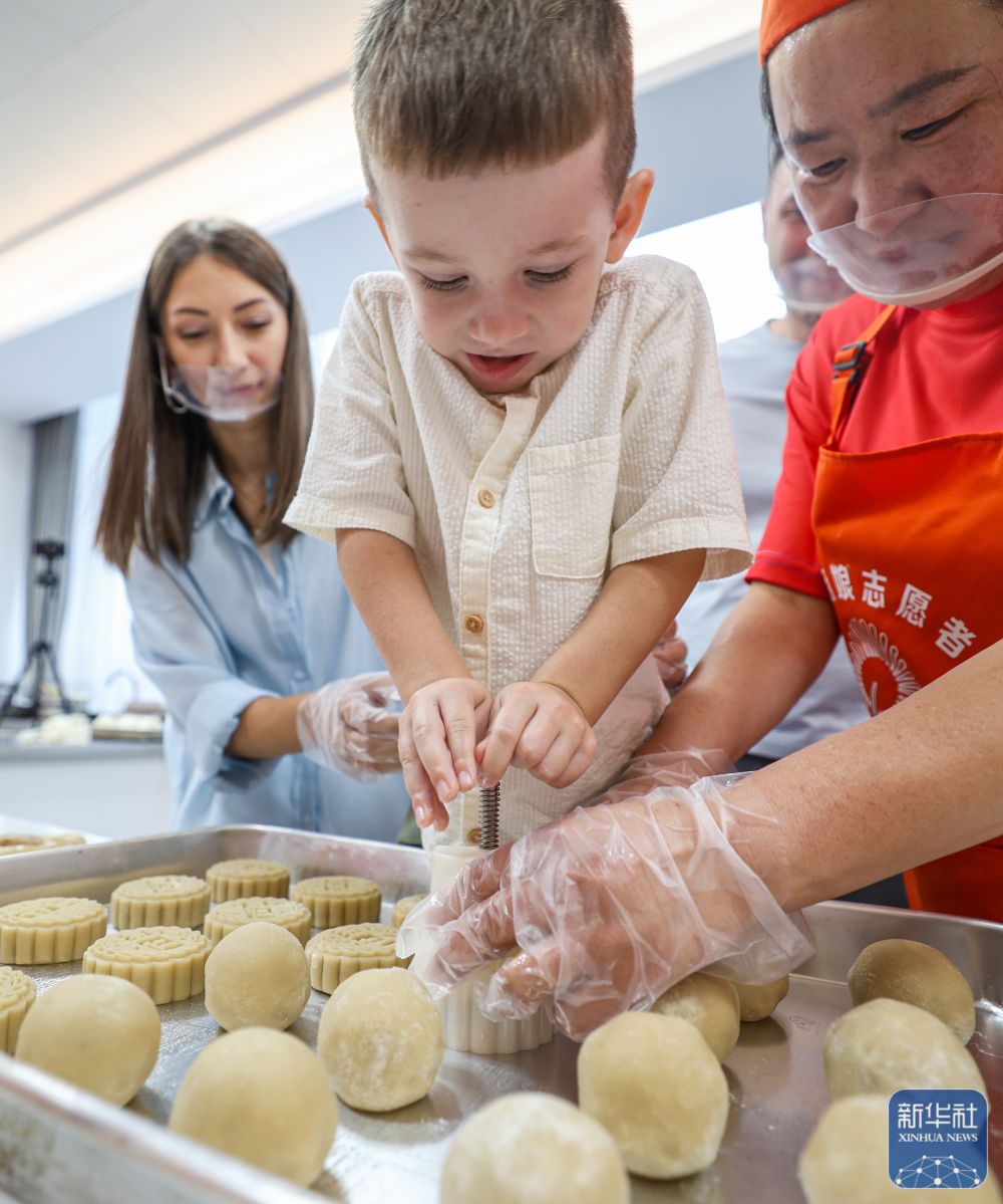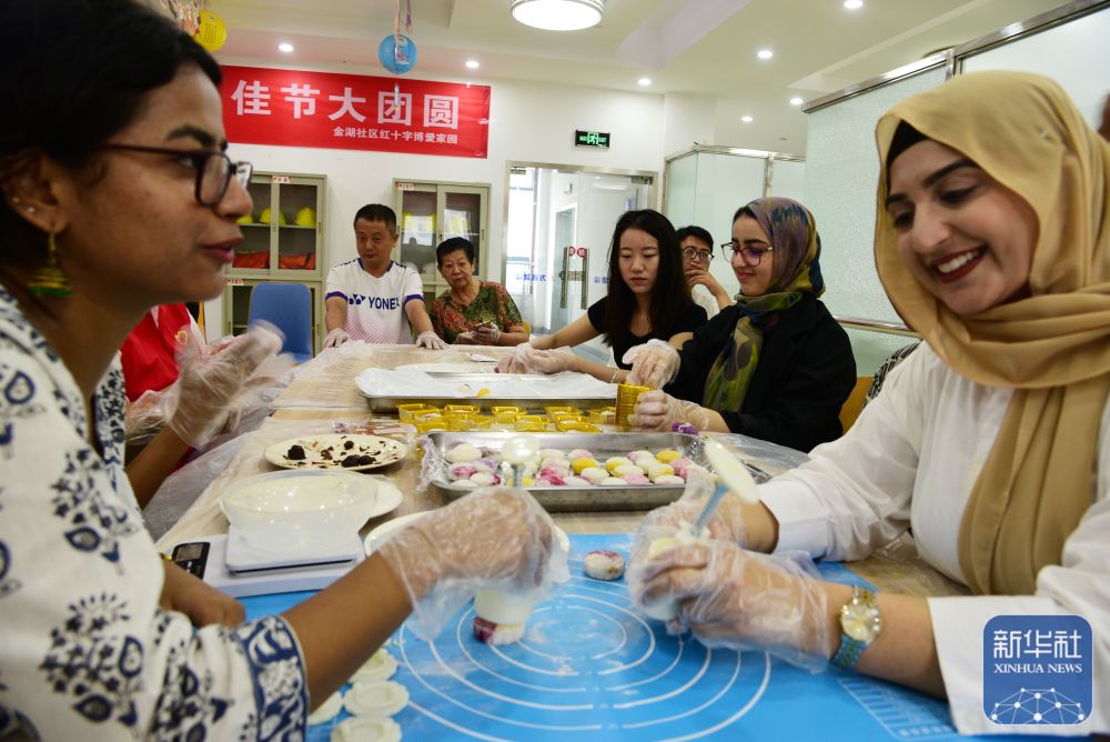 9月11日,在江苏省镇江市金湖社区,江苏大学的外国留学生和居民一起制作月饼。新华社发(石玉成摄)