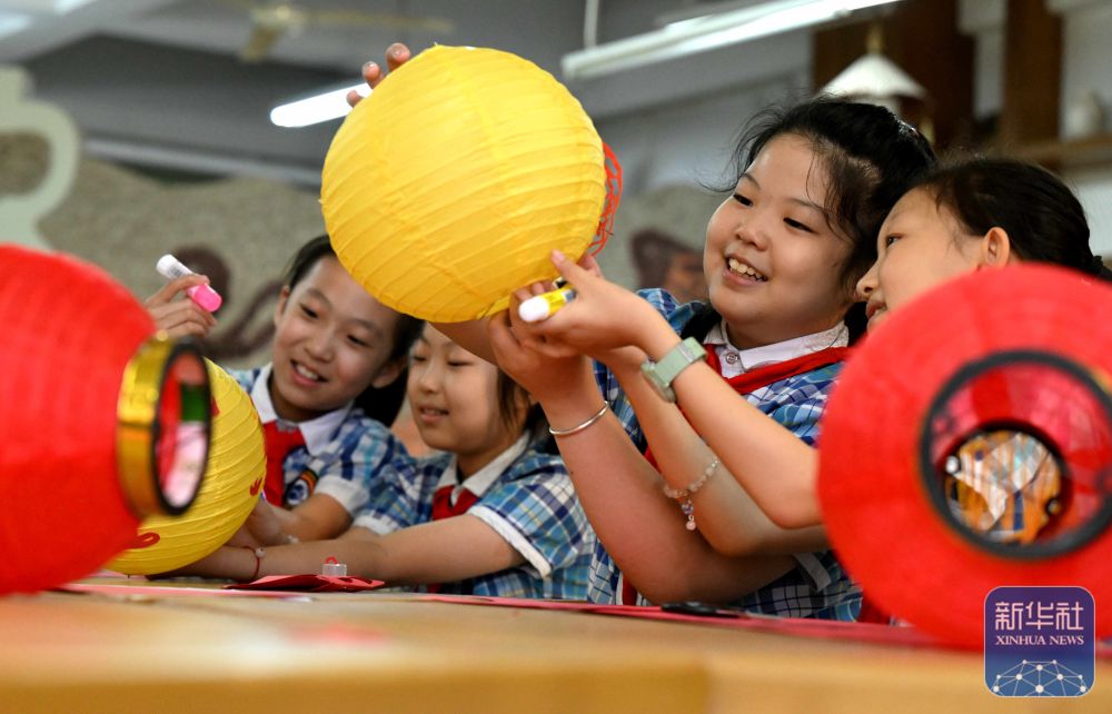9月11日,在河北省石家庄市桥西外国语小学迎中秋活动中,孩子们在制作花灯。新华社发(陈其保摄)