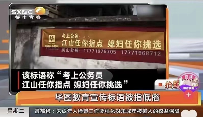 近日,有网友反映,知名公考培训机构“华图教育”的课堂宣传标语赫然写着“如果你不努力,你的女儿可能被同龄人抱着;你努力,你抱着同龄人的女儿”。
