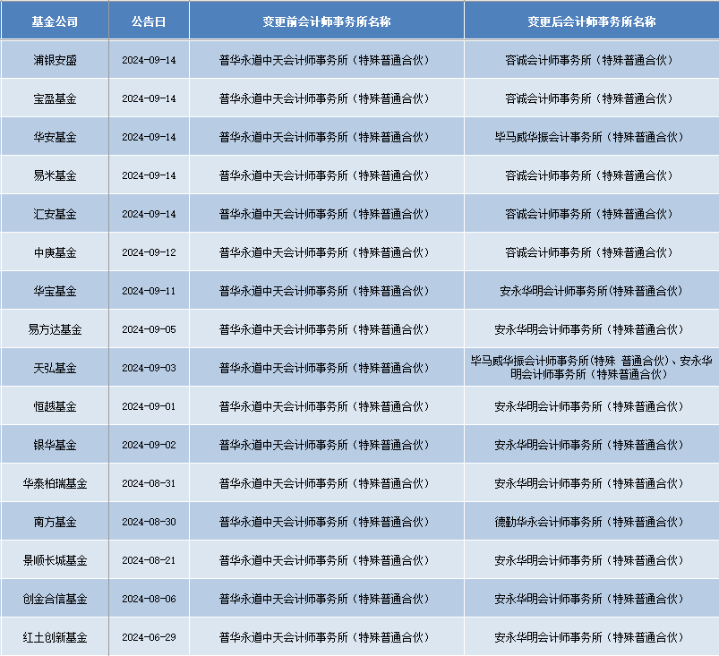具体而言,9月以来,除了上述5家基金公司,普华永道还被中庚基金、华宝基金、易方达基金、天弘基金、恒越基金、银华基金等改聘。