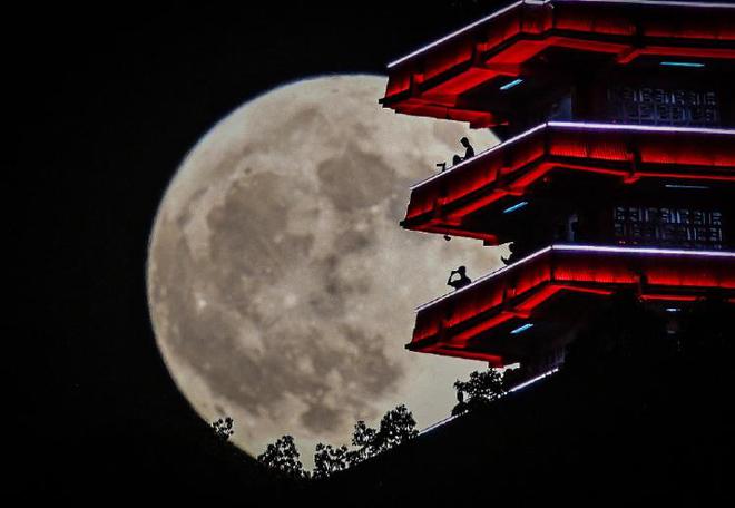8月19日晚,渝中区鹅岭公园瞰胜楼,市民正在欣赏难得一见的“超级月亮”。首席记者 龙帆 摄
