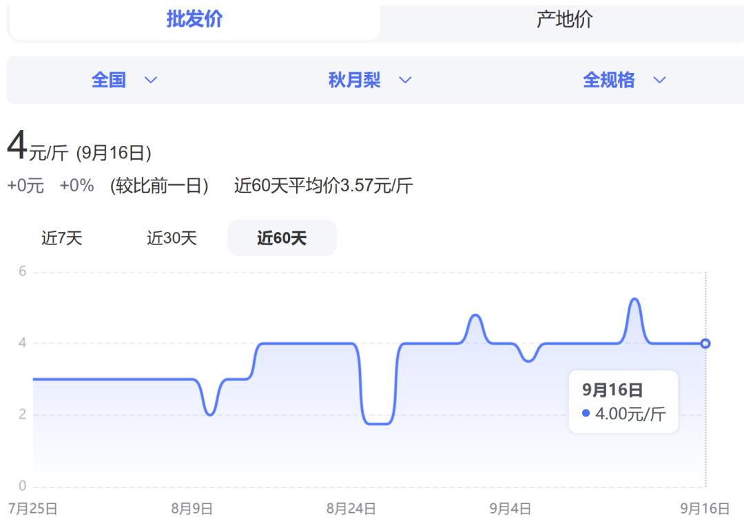 9月16日,秋月梨全国批发价为4元/斤,图源:一亩田