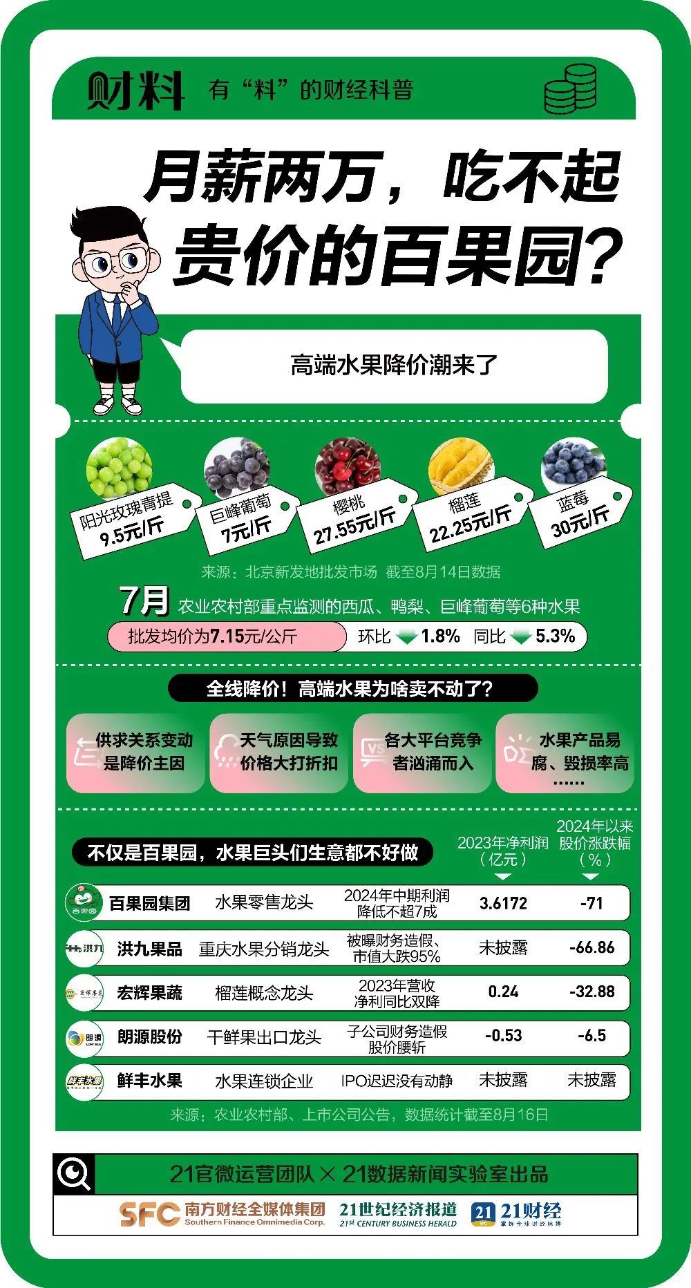 今年以来,不少高端水果陆续传出降价消息——“蓝莓论斤卖”“榴莲价格大跳水”“樱桃价格腰斩”……国家统计局数据亦显示,上半年,我国鲜果价格下降较明显,降幅达7.8%。