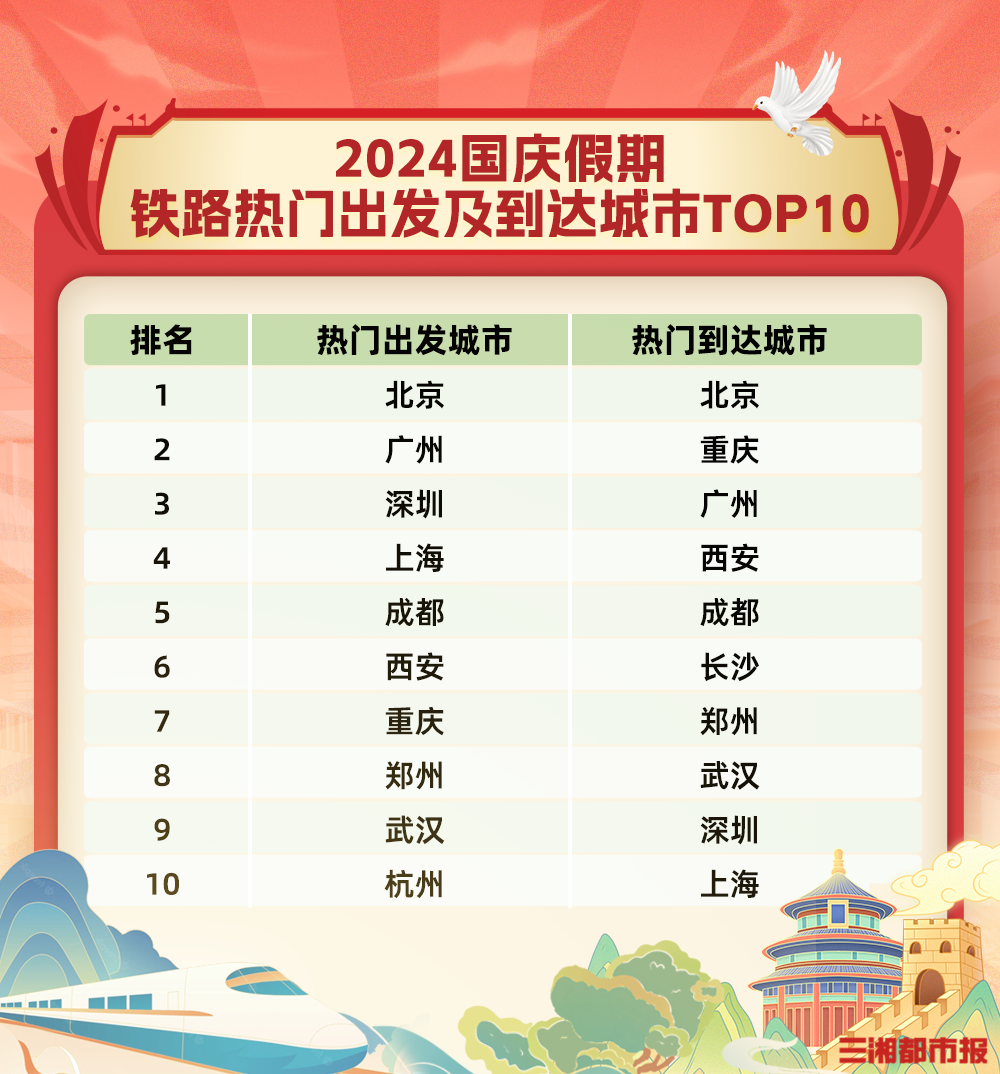 根据国内旅行OTA平台数据显示,9月29日和30日两天是全国铁路和民航国庆假期前的出发客流量高峰时段,热门线路的火车票“一票难求”,机票价格也处于整个假期的相对高位。主要原因是大量旅客选择节前2至3天休假提前开始假日旅行。热度较高的节前出发城市主要有:北京、广州、深圳、上海、成都、西安、重庆、郑州、武汉、杭州等,基本上以一线城市和区域中心城市为主。热门到达城市主要有:北京、重庆、广州、西安、成都、长沙、郑州、武汉、深圳、上海。